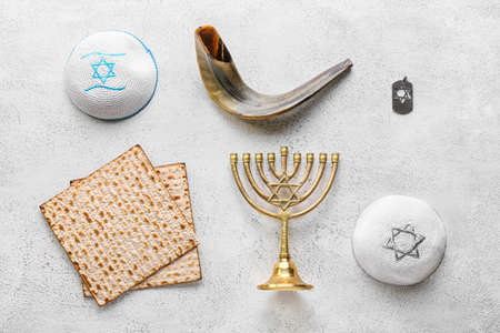 Jewish symbols: customary religious kippah cap, a Star of David and a foundation of a menorah (a seven-lamp candelabrum) with the word Jerusalem written on it. Zionism symbol.