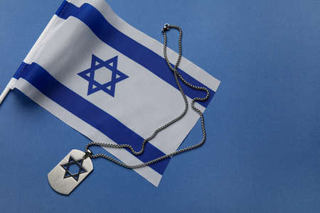 Holocaust Remembrance Day. Burning candles on flag of Israel, closeup
