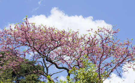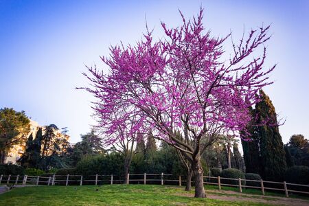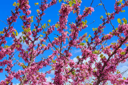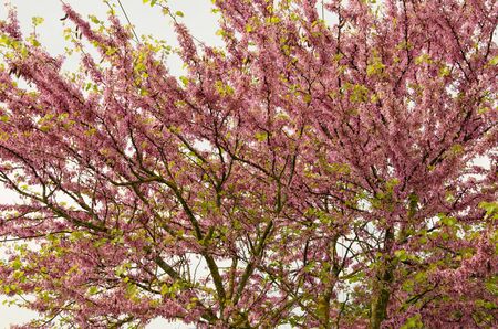 Cercis siliquastrum. Blooming spring tree with pink flowers.