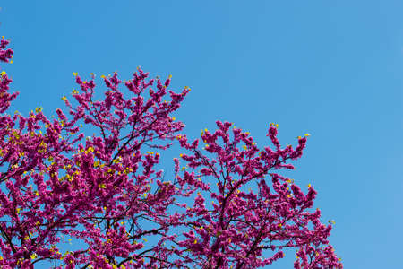 blossom tree Cercis siliquastrum with red flowers on blue sky background