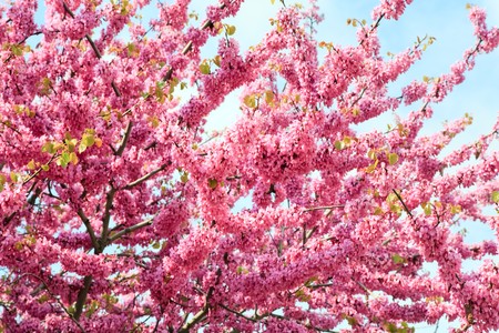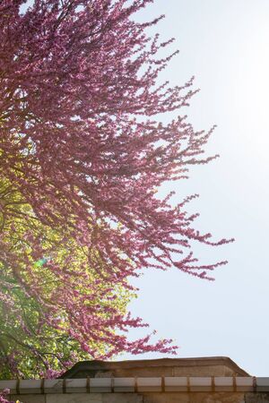 Branches of the Cercis tree with bright pink flowers against a blue spring sky and sunlight
