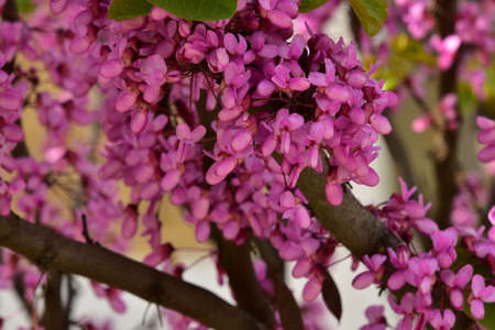European Cercis, or Judas tree, or European scarlet. Close-up of pink flowers of Cercis siliquastrum. Cercis is a tree or shrub, a species of the genus Cercis of the legume family or Fabaceae.