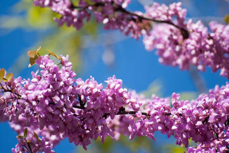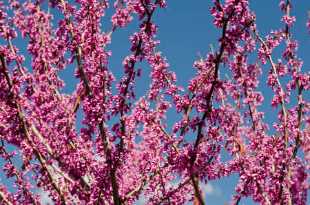 Thin branches of blossoming cercis canadensis against blue sky in mid May