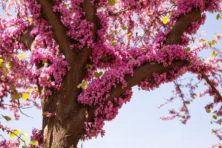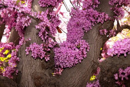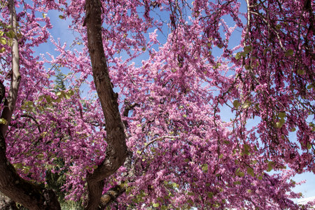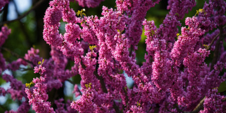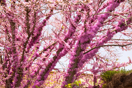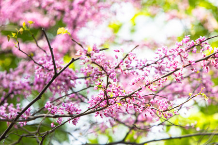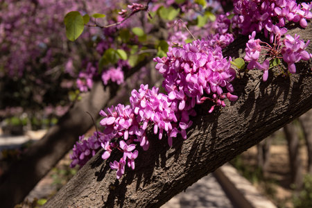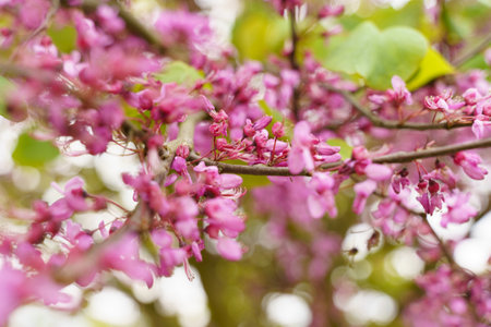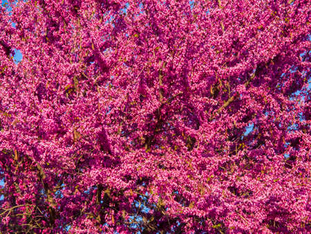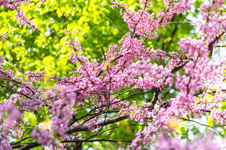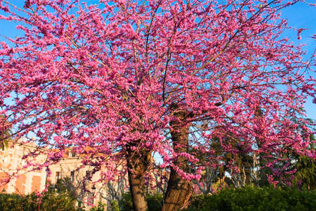 Many vivid pink flowers of Cercis siliquastrum, commonly known as Judas tree or Judas-tree, in a garden in a sunny spring day, beautiful outdoor floral background photographed with selective focus