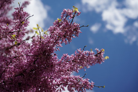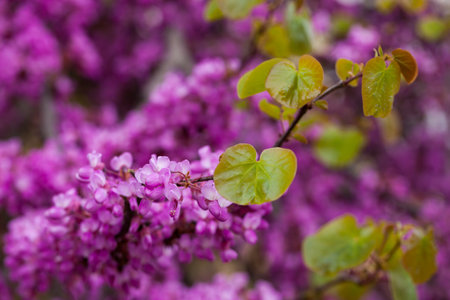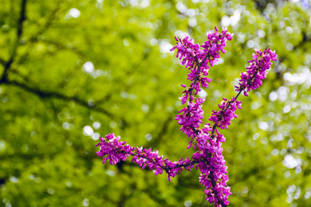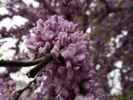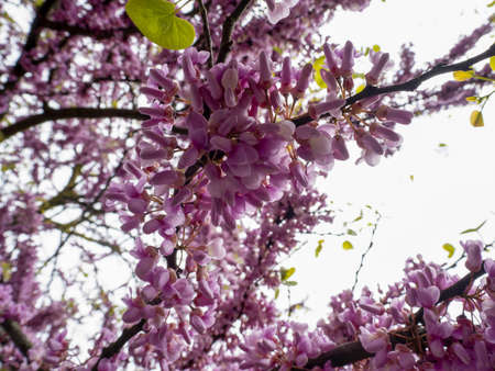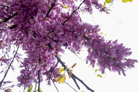Spring flowering Judas Tree bright purple flowers and small leaves on the stem