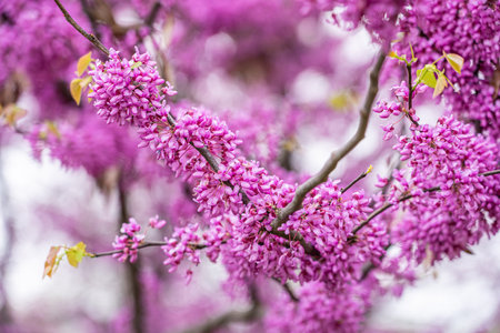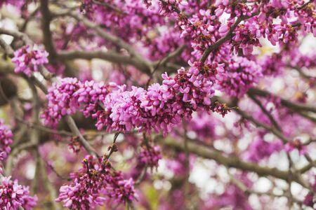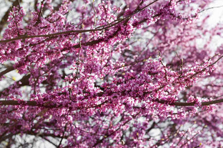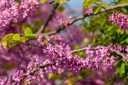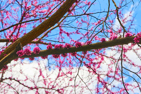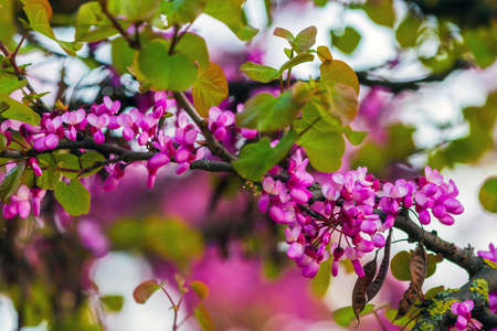 American Eastern Redbud Tree or Cercis canadensis blossoming in a park close up. Selective focus. Nature concept