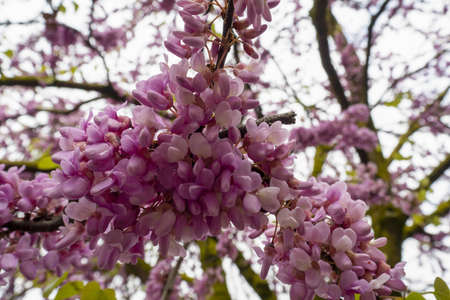 Close up of violet blossoming Cercis siliquastrum plant at Caucasus area