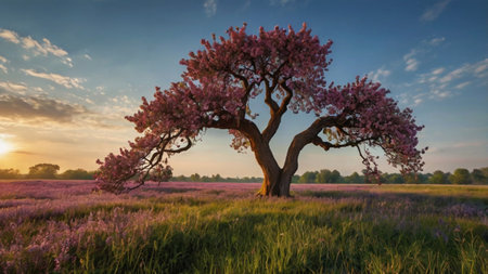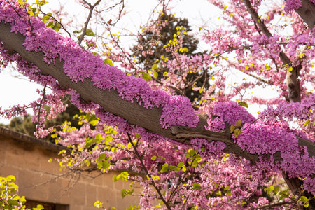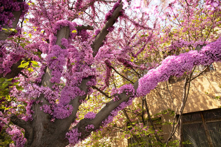 Vibrant pink blossoms of a Judas tree adorn the facade of a cream colored building, adding a touch of spring beauty to its balconies and windows. Judas tree branches laden with bright pink flowers