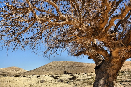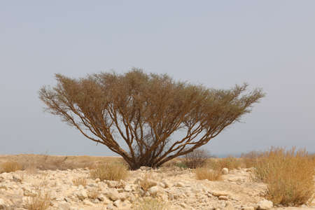 Acacia tree at Sodom Saltmarsh Lake also known as Swan Lake located at the southern part of the Ashalim Reservoir near the Dead Sea in southern Israel