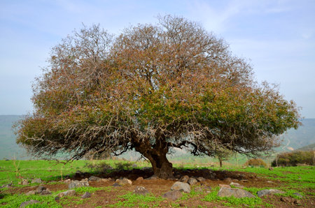Old branched Oak tree in autumn, Golan Heights in Israel.