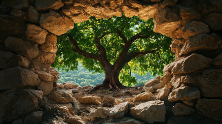AI Generated. Tree through with looking trees over soaring surrounding edge