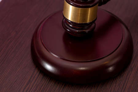 Judge hammer on brown wooden desk close up.