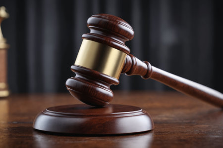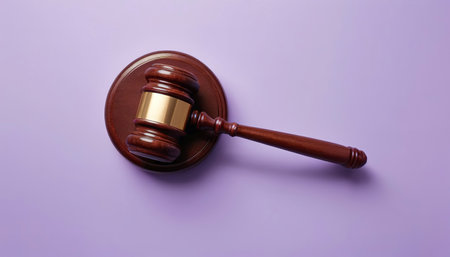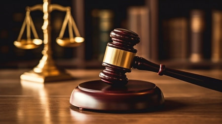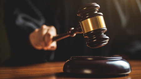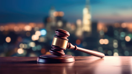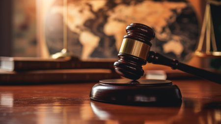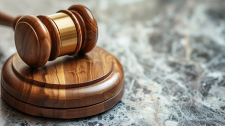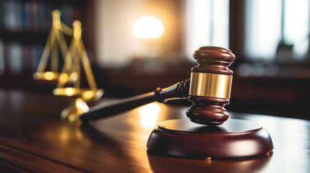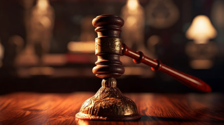 A classic wooden gavel rests on a brown wooden table, symbolizing legal authority and justice in a courtroom setting. Soft lighting enhances the elegance.