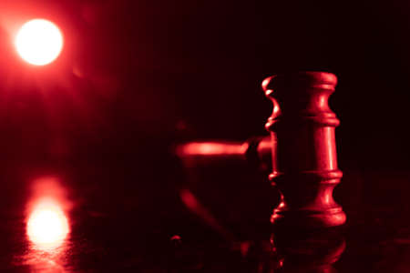 Law, justice concept. Creative artwork table decoration with mallet of the judge on dark foggy background with colorful light. Selective focus