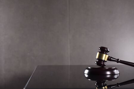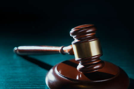 Law theme, mallet of the judge on wooden desk. Law gavel on dark foggy background with light. selective focus