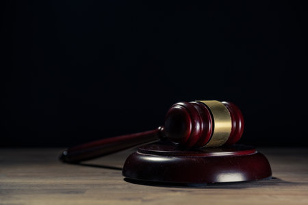 A judge's gavel resting on a wooden surface against a dark, unfocused background
