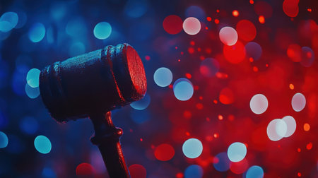 A striking gavel stands prominently against a vibrant bokeh backdrop of red and blue lights, evoking themes of justice and authority in a dynamic setting.