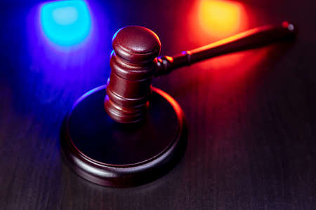 law theme. Court of law trial in session. Judge gavel on wooden table with police emergency services light. Mallet of judge on dark background. justice human rights concept. copy space