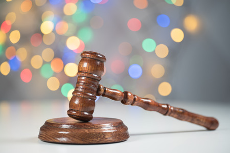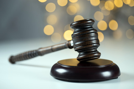 Law theme, mallet of the judge, golden bokeh background