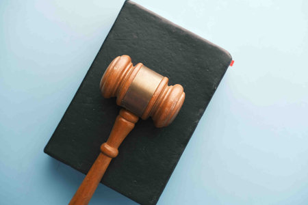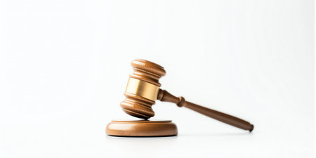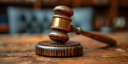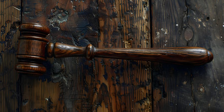 A gavel resting on a table symbolizing law justice or authority. Concept Legal Symbolism, Gavel, Law and Justice, Authority Symbol, Courtroom Decor