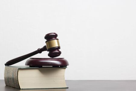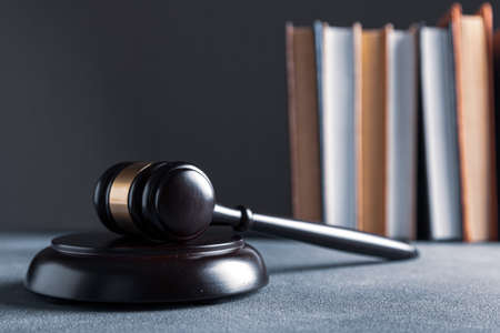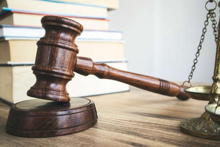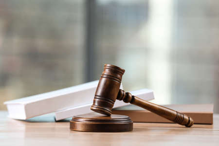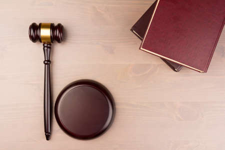 Brown wooden judges gavel on the table in close up. Wooden table, books. Space for text. Law and Justice theme