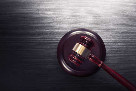 Law theme, mallet of the judge on wooden desk. Law gavel on dark foggy background with light. selective focus