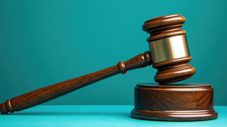 A judge's wooden gavel resting against a turquoise background, symbolizing justice and law with a modern touch.