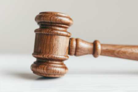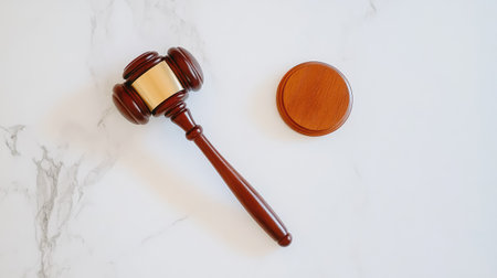 This elegant wooden gavel rests on a marble surface, representing justice and authority in legal proceedings. A minimalist design enhances its professional appeal for various uses.
