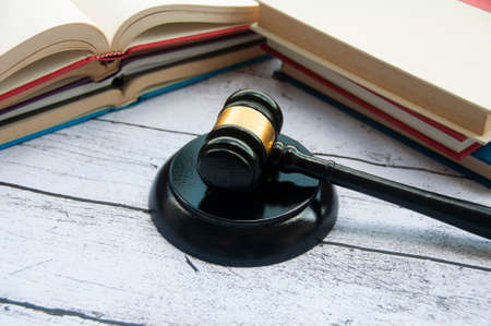 Judge's gavel hitting block with books on the background. Law and justice concept