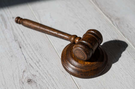Wooden judicial gavel on a wooden laminate.