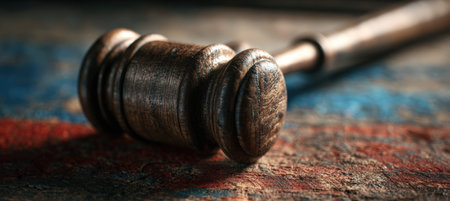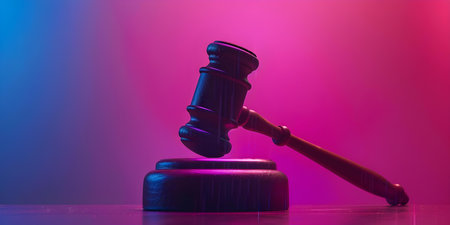 A striking gavel stands prominently against a vibrant bokeh backdrop of red and blue lights, evoking themes of justice and authority in a dynamic setting.