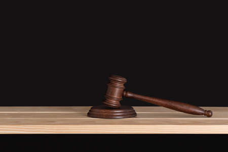 Wooden judge gavel on wooden table, black background. Wood hammer auction.
