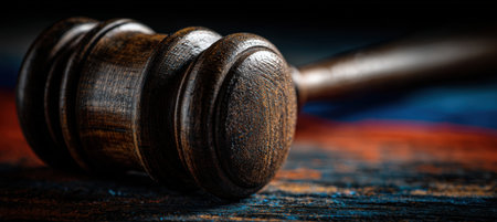 Artistic macro image of a gavel's wood texture with blurred sanction blocks in the background. Faint Russian flag colors blend softly, creating an abstract interpretation.