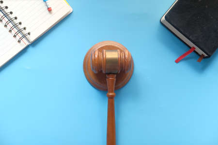 Gavel on blue background view from the top with space for text, legislation symbol