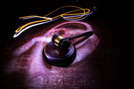 Law, justice concept. Creative artwork table decoration with mallet of the judge on dark foggy background with colorful light. Selective focus