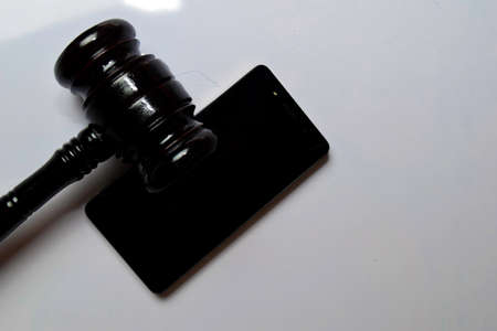 Black smartphone and gavel isolated on white background. Justice and Law Concept