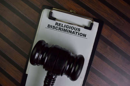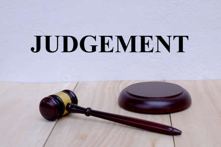 Judgement written on the wall with gavel on wooden background. Law concept.
