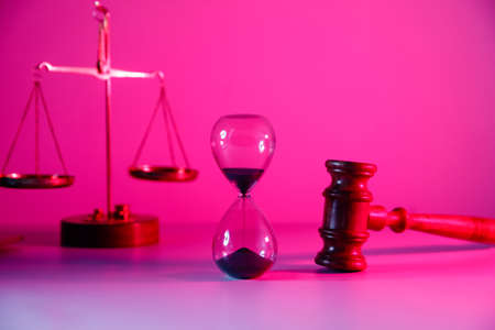 Hourglass, scales and wooden judge gavel in pink neon