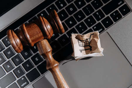 Spoiled paper box and gavel on keyboard close-up. Consumer and law concept. Shipment accident