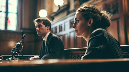 Cinematic image depicting a gavel in focus with blurred professionals in suits in the background, symbolizing the justice system. The scene conveys authority and legal proceedings.