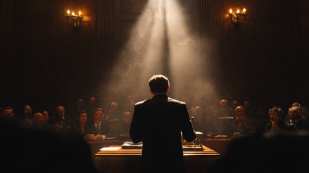 Attorney's Moment Before the Court. Concept Legal Brief Preparation, Courtroom Dramatics, Last-Minute Case Review, Stressful Proceedings