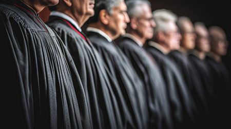 This image captures a lineup of judges in traditional robes, symbolizing the announcement of a significant constitutional court ruling, embodying the authority of the judiciary.