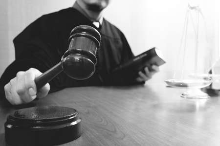 justice and law concept.Male judge in a courtroom with the gavel and working with holy book and brass scale on wood table,black and white