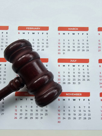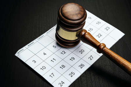 Calendar and gavel on a table showing days of the week and months