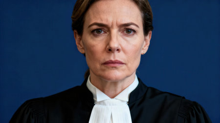 Medium of a stern-faced woman in a dark legal gown with a bright white jabot collar, illuminated by soft lighting against a royal blue wall.