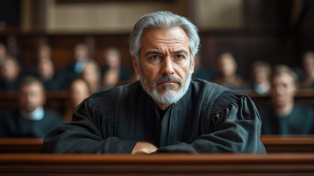 Serious judge sitting in courtroom presiding over trial listening to lawyers and jury members