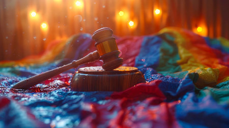 Wooden judge gavel and rainbow flag on wooden table. LGBT concept.