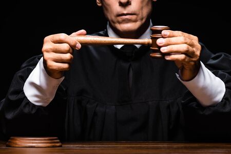cropped view of judge in judicial robe sitting at table and holding gavel isolated on black