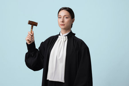 Judge with mallet on light blue background