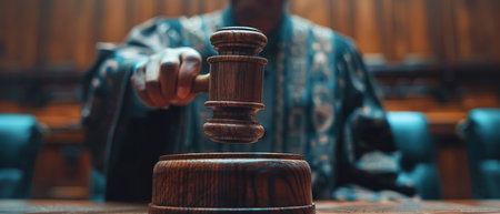Close-up of a judges hand holding a gavel above a sounding block, poised to deliver judgment, symbolizing authority